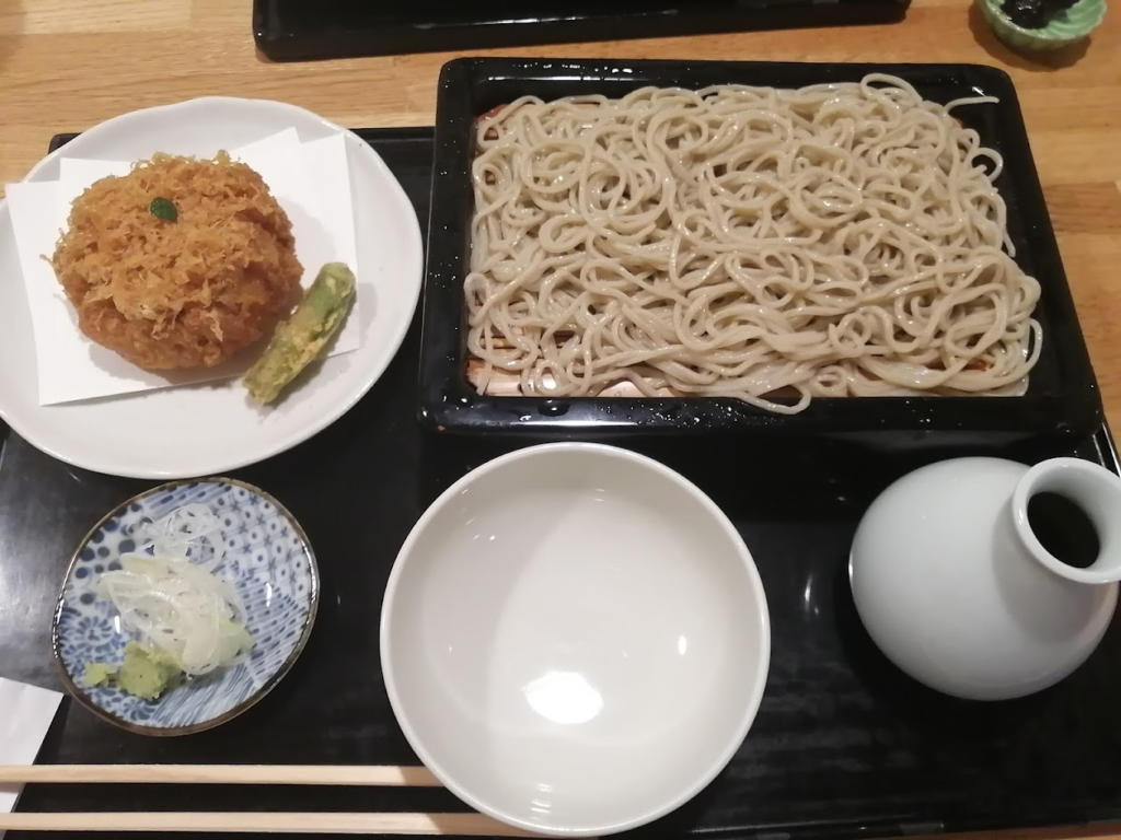 湯葉、舞茸の天ぷら、角煮、天せいろ(天ぷらは小エビのかきあげ、めっちゃうまい)