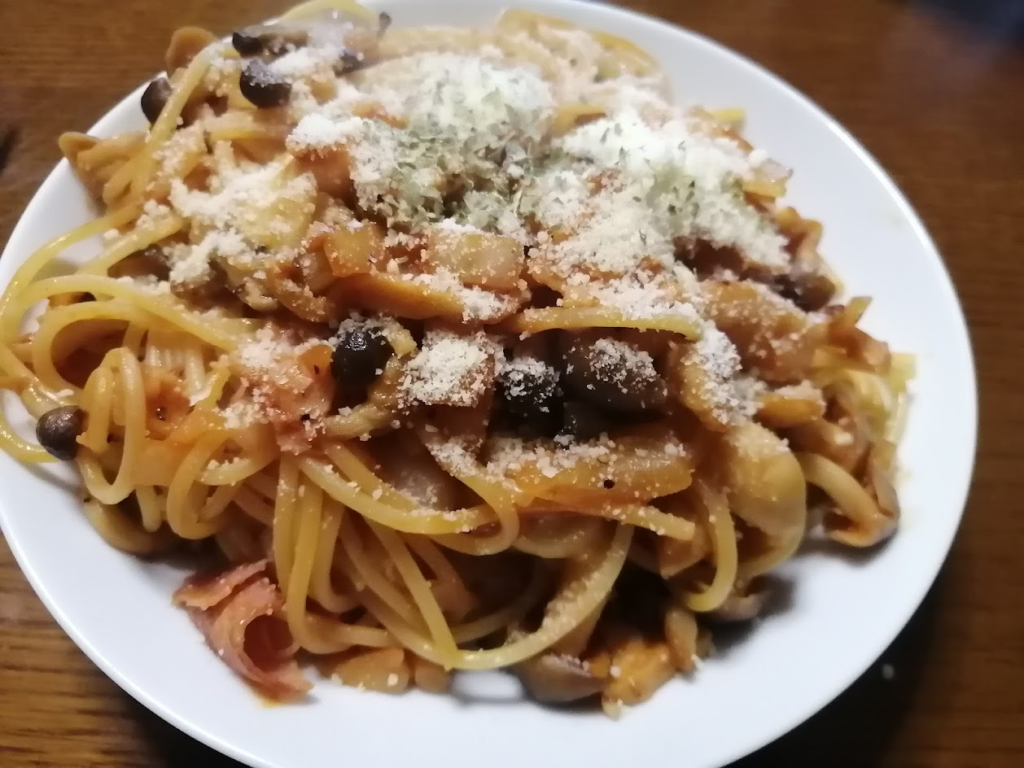 昼食を作ろうとパスタを茹で始めたはいいが、大蒜がなかったことが発覚。とりあえず玉ねぎとしめじとベーコンを炒めてトマトペースで和えてみた。美味かったのでOK