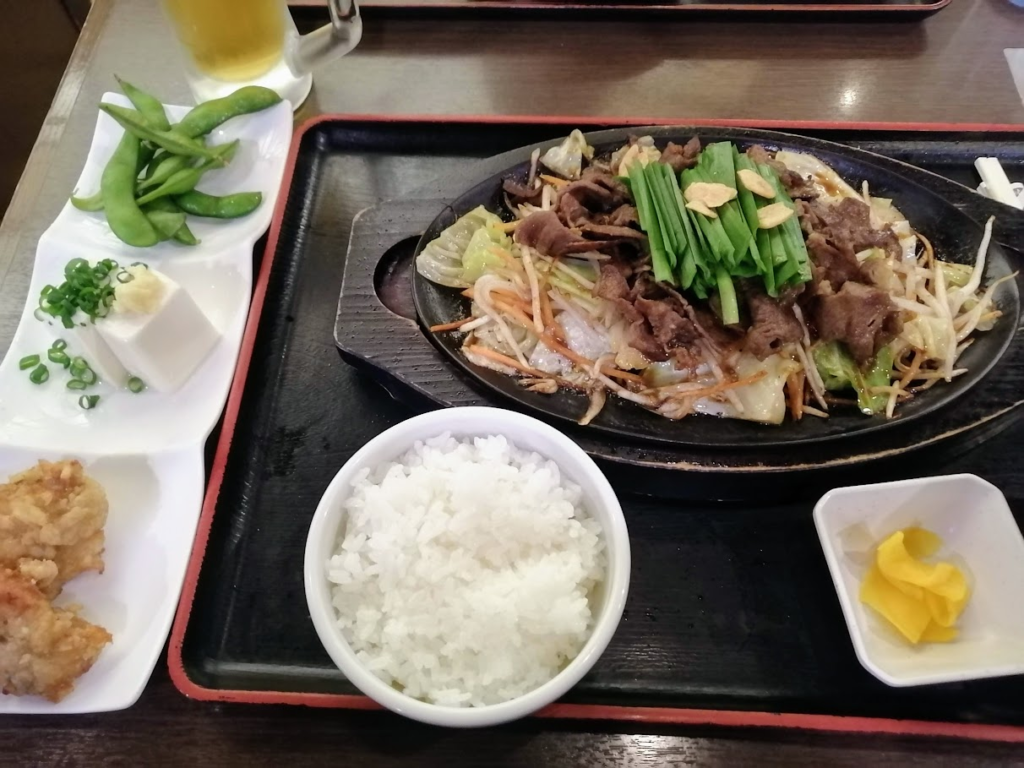 風呂のあと夕食。スタミナ焼きみたいなのをいただいた