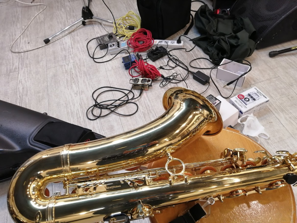 しかたないので、とりあえずあるケーブルだけを使い、エフェクターをかけてのサックス演奏を試す。主にマルチエフェクターの設定に時間をかけた。まあまあいい感じか。
